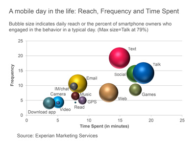 On average, smartphone owners devote 26% of the time they spend on their phone talking and another 20% texting. Social networking eats up 16% of smartphone time while browsing the mobile web accounts for 14% of time spent. Emailing and playing games account for roughly 9% and 8% of daily smartphone time, respectively, while use of the phone’s camera and GPS each take up another 2% of our smartphone day.